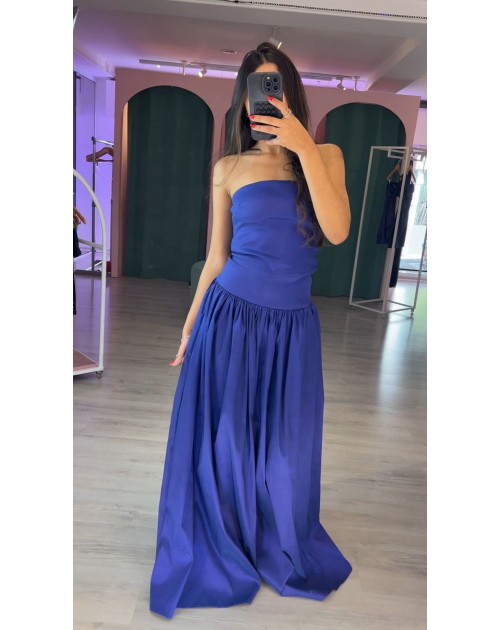 Vestido longo em tafetá azul, com busto justo e modelagem que valoriza o corpo na medida certa. A barra com calda drapeada traz movimento e um toque de drama fashion.